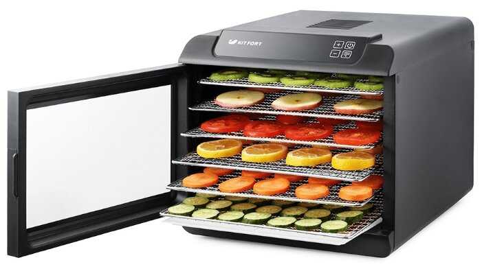 Давно планировал горизонтальный дегидратор в качества подарка родителям, старенькая вертикальная сушилка уже изжила себя и вся потрескалась. Общий ассортимент устройств такого плана у Kitfort большое количество, попробуй еще выбрать…, но остановился на данной модели. Компактный, много противней, в т.ч. из нержавейки (что немаловажно). Заказ приехал вовремя, как и планировалось. Упакован дополнительно в картонную коробку, товарный вид подарка не пострадал. За такую правильную упаковку отдельное спасибо! Распаковали и сразу испробовали в работе. Все интуитивно понятно, работает тихо, правильно поддерживает устанавливаемую температуру. Качественная сборка из нормального пластика, надеюсь прослужит долго. Первые впечатления прекрасные, подарок очень понравился, теперь ждем сезона овощей и фруктов, но мясные закуски и колбаски уже готовим. Спасибо!