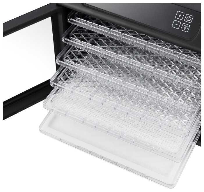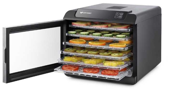 Выбрал данный вариант опираясь на положительные отзывы. Уверен, что не прогадал. удобные лотки и горизонтальная загрузка. Интуитивно понятная панель управления, в инструкции есть ориентиры по времени и температуре сушки тех или иных продуктов. Единственное что, было бы не плохо описать более подробно назначение лотков. Но как я понял в основной лоток укладывается сеточка, сплошной поддон чисто для капель и укладывается на дно сушилки, но зачем их шесть штук я не понял). В первый день засунул все лотки в посудомойку, помыл. В качестве эксперимента порезал на кусочки дыню и на ночь поставил сушиться. Утром перевернул лоток и поставил ещё на 4 часа. Что могу сказать, результатом доволен! Ребенок уничтожил всё насушенное) Получился классный десерт. Покупкой доволен. Рекомендую