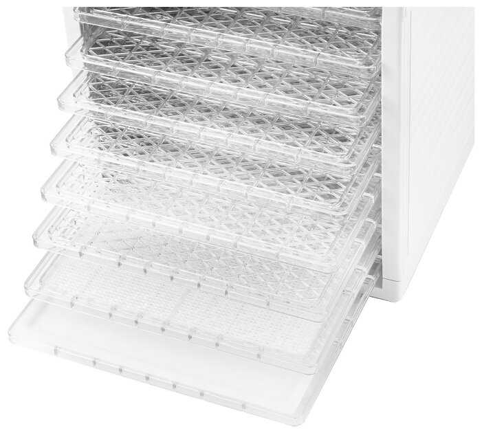 - В набор входят 9 стандартных поддонов, 9 с мелкой сеткой для зелени/семян и 9 лотков для пастилы.
