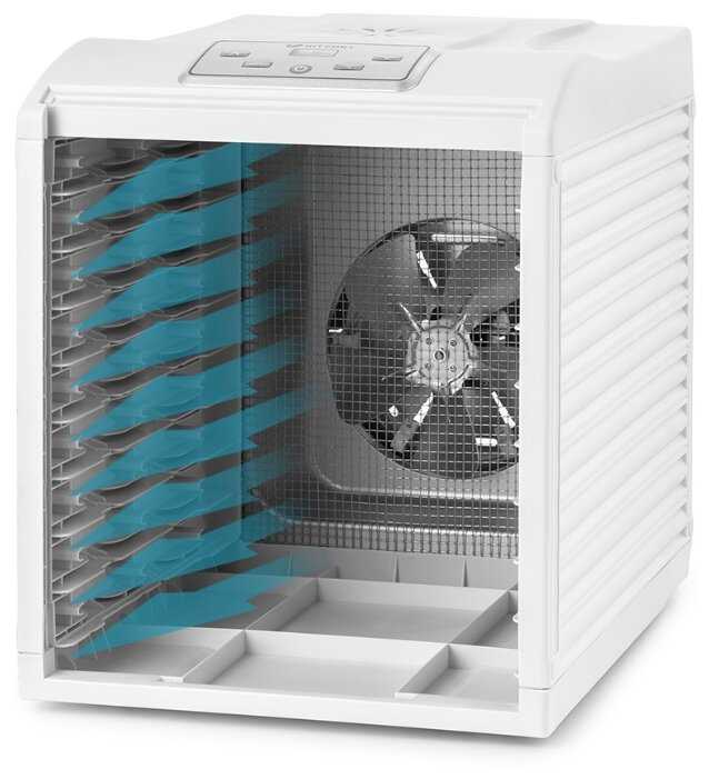 Горизонтальный обдув — это магия: Это ключевое преимущество. Вентилятор и нагревательный элемент расположены сзади, поэтому воздух распределяется равномерно по всем поддонам. Забудьте о перестановке лотков каждые пару часов. Я просто выставляю температуру (обычно 55–60 °С) и таймер, и могу спокойно заниматься своими делами. Все просушивается идеально, от верхнего до нижнего лотка.