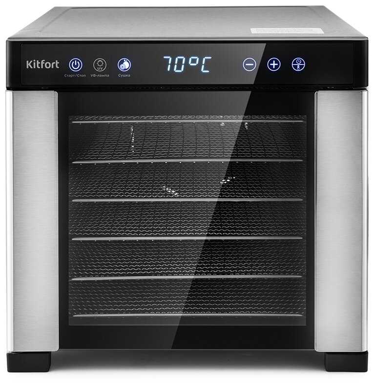 УФ-лампа, специально выбирала с ней. К тому же сушилке нашлось и другое применение: использую, как турбо-сушку для посуды. У посудомойки на самой короткой программе отсутствует режим сушки, вот тут-то Kitfort и выручает. Как подогрев для чашек и тарелок тоже здорово работает. - - Об отсутствии книги рецептов не писал только ленивый, как и о маркой поверхности. Ну не оттираются от неё следы пальцев и всё тут. Температура отличается от выставленной на 4-5⁰, то есть если вы выставили 50⁰, то факту внутри сушилки она будет 45-46⁰, проверяла неоднократно. Пластиковые сетки меньше металлических на 3 см, то есть места ещё меньше для сушки. Вот не понимаю, почему нельзя было сделать одного размера.
