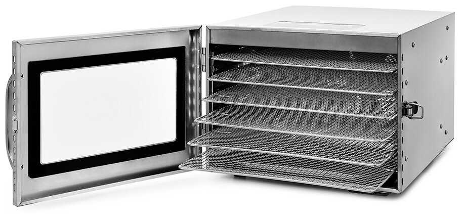 - + Отличная электрическая сушилка из нержавеющей стали. Имеет в комплекте 6 поддонов для сушки и 1 поддон для жидкости. Вентилятор обеспечивает равномерное распределение нагретого воздуха по всему объему камеры.