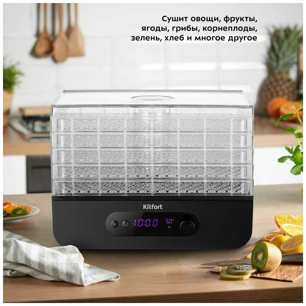 Рассчитана на умеренные объёмы: для заготовки 1 кг сушёных яблок потребуется 5-6 циклов. Оптимальна для экспериментальных партий (цукаты из дыни, вяленые томаты) или регулярного приготовления полезных снеков (фруктовые чипсы, мясные джерки). -