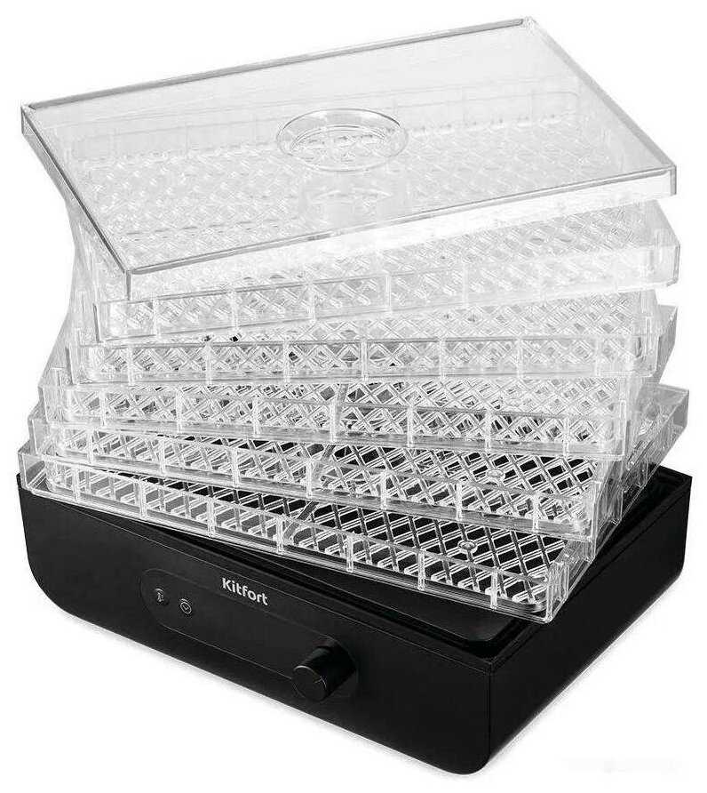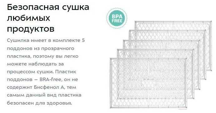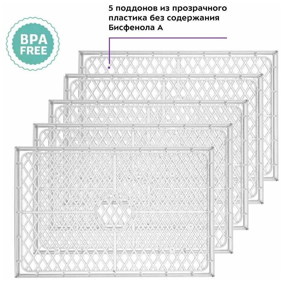 - Прозрачные поддоны из термостойкого пластика (без запаха) обеспечивают визуальный контроль без прерывания сушки.