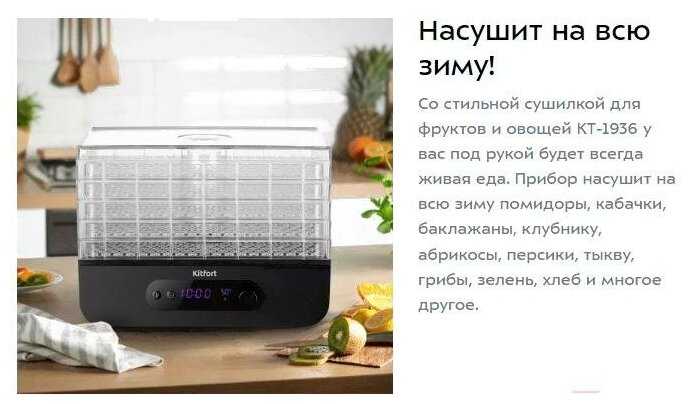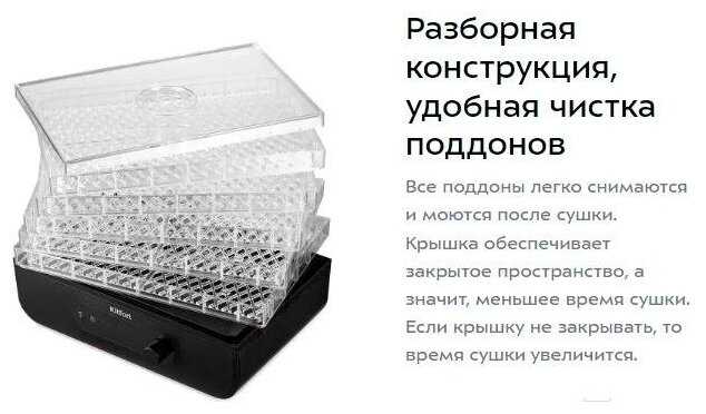 - + это устройство в надёжно собранном корпусе из добротного материала. система обдува обеспечивает равномерное просушивание. управление очень простое. есть таймер и звуковой сигнал. поддоны удобные. включил, надад кнопку, выключил, когда прозвучит таймер. поддоны удобно мыть. на кухне занимает совсем мало места. покупкой довольна, рекомендую