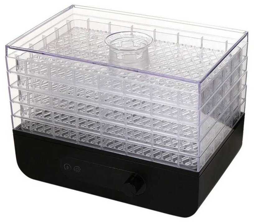 - Нижнее расположение вентилятора распределяет тепло по всем 5 ярусам, но требует периодической перестановки поддонов для равномерной сушки.