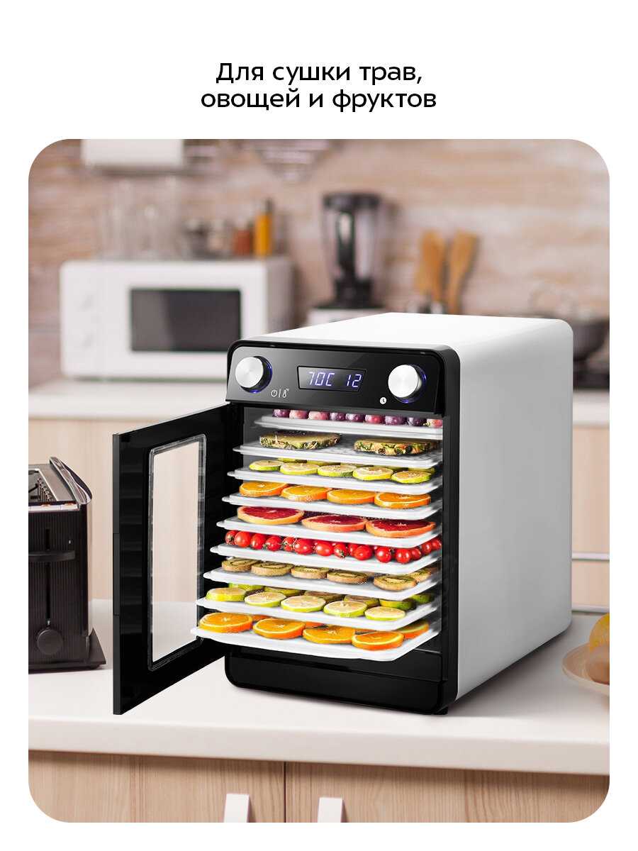 - + Корпус сделан крепко, выдержит нагрузки без проблем. Размеры небольшие, поэтому занимает минимум пространства на кухне и просто убирается в шкаф. Хотя выглядит миниатюрной, но внутри хватает места для нормального объема продуктов. К тому же в комплекте сразу несколько поддонов, что удобно для разных партий сушки.