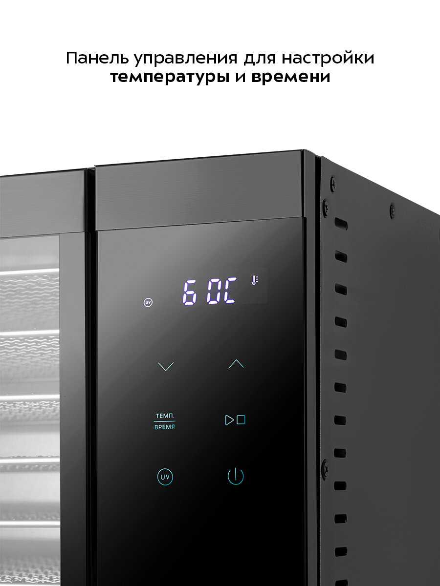 Когда приобретал данную модель, был удивлен и немного обеспокоен отсутствию отзывов, но все это зря. Сушилка отличная. Пробовал сушить курицу, яблоки, бананы. Куриные чипсы получаются невероятно вкусными, и в то же самое время очень полезными. В комплекте 8 металлических поддонов, что позволяет загрузить довольно таки много продуктов, более 2кг куриного филе порезанного на слайсы влезет точно. Очень хорошее расстояние между поддонами. Удобное управление, легко выставить таймер и необходимую температуру. Наличие УФ-лампы конечно тоже большой плюс. Сушилкой очень доволен. Рекомендую.