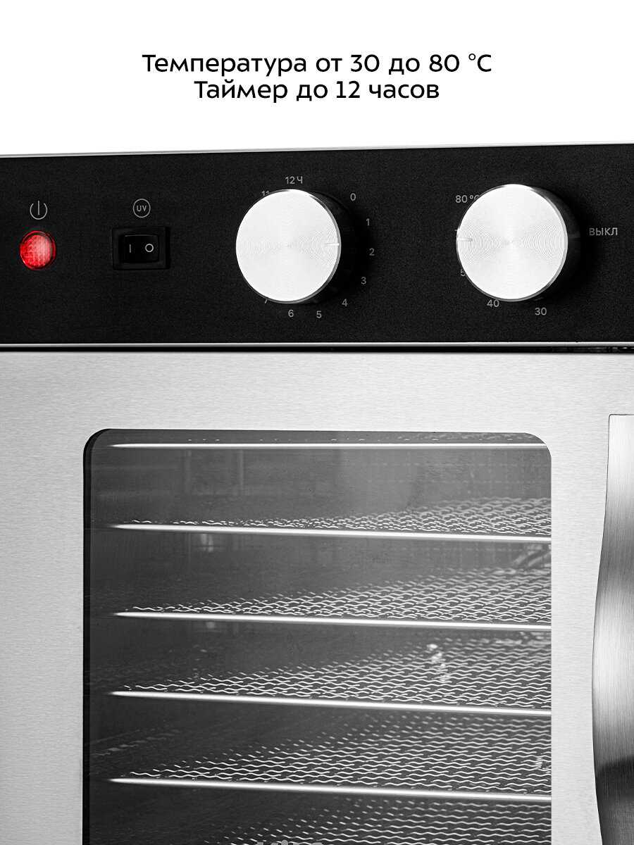 выбирала из нескольких вариантов, чтоб не очень большая, но вместительная, обязательно металл, и с УФ лампой для стерилизации, остановилась на этой модели. скажу сразу- стенки у неё одинарные и греются сильно, ставить её нужно на значительном расстоянии от других предметов, таймер всего на 12 часов, но для меня этого достаточно. управление механическое, для меня это плюс, но любителям электроники, где надо просто нажать кнопку не подойдёт. отличная комплектация: решётки основные металлические из нержавеющей стали 6 шт., в таком же количестве пластиковые решётки для зелени, и пластиковые поддоны для пастилы, тоже 6 шт. для меня такой полный набор вообще находка. по вместимости: пол вёдра сливы разделённой пополам поместилось в одну полную закладку. удивилась такой вместительности, поддоны кажутся маленькими. в результате покупкой довольна, однозначно рекомендую