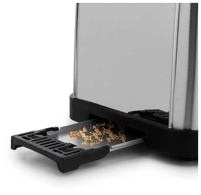 Из плюсов можно отметить наличие поддона для крошек (он вытаскивается сзади) и то, что во время работы корпус остается еле теплым.