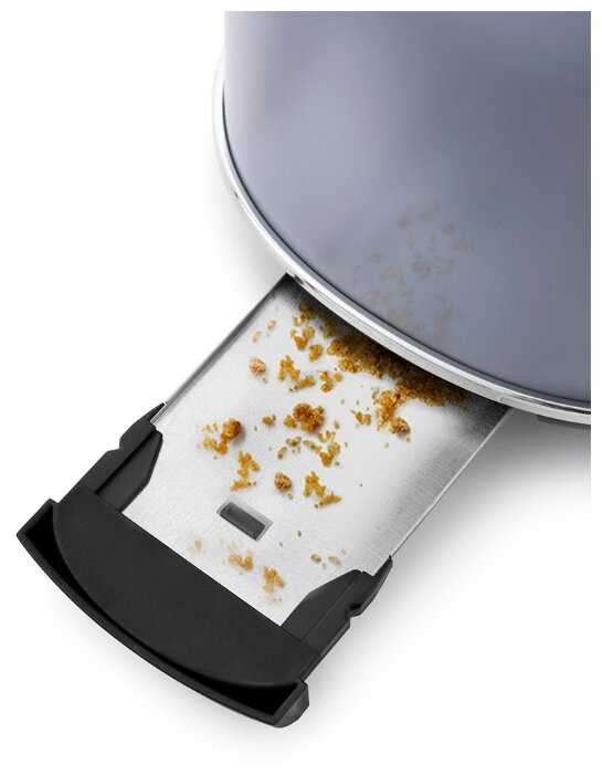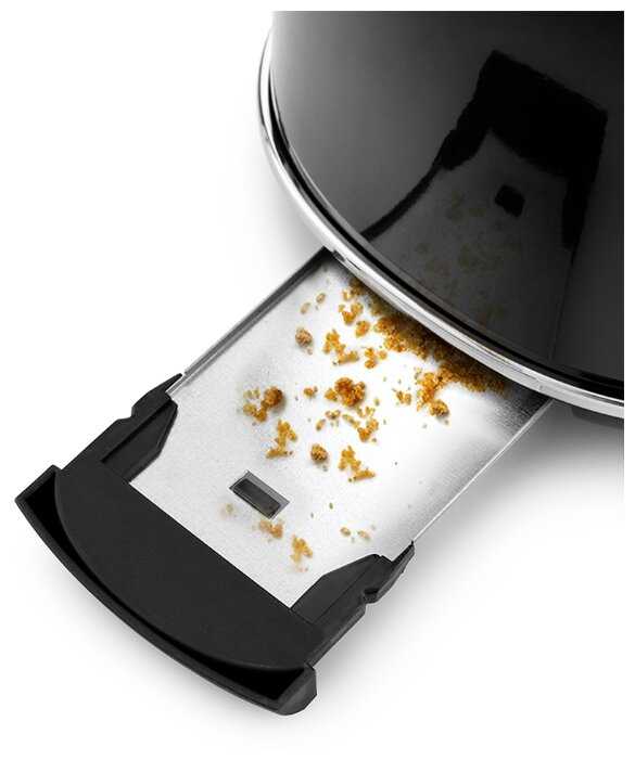 - Съемный поддон для крошек собирает отходы, легко выдвигается, вытряхивается и моется; предотвращает разброс крошек по столу.