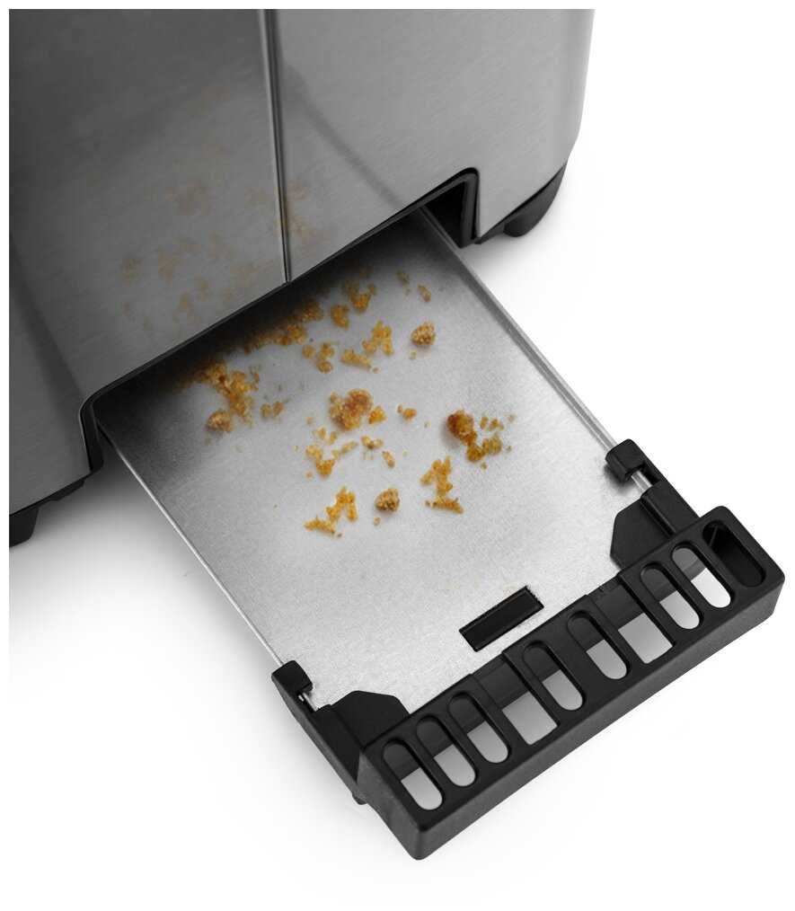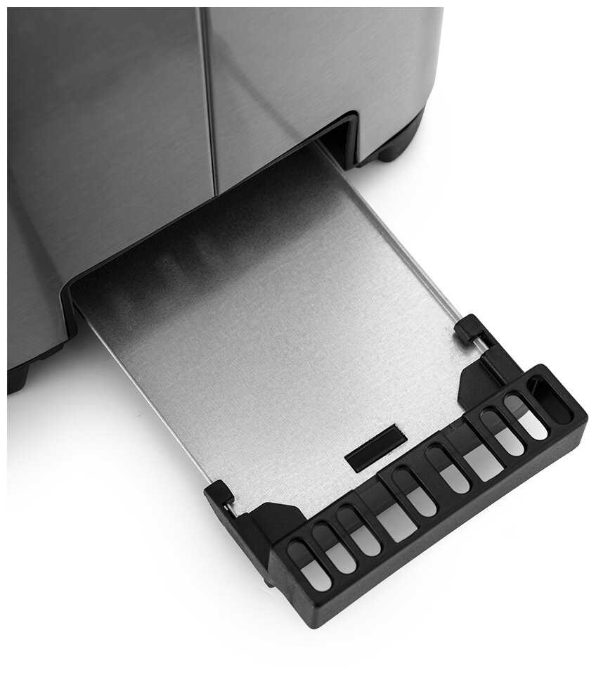 - Съемный поддон для крошек выдвигается без усилий, собирает все остатки, не нужно переворачивать устройство.