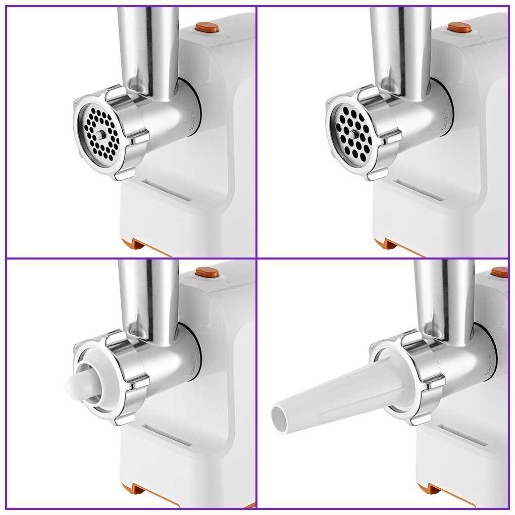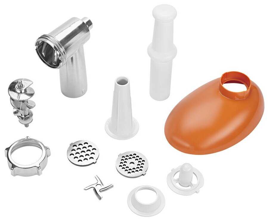 - В комплекте — насадки для колбас, кеббе и сменные решетки, расширяющие кулинарные возможности.