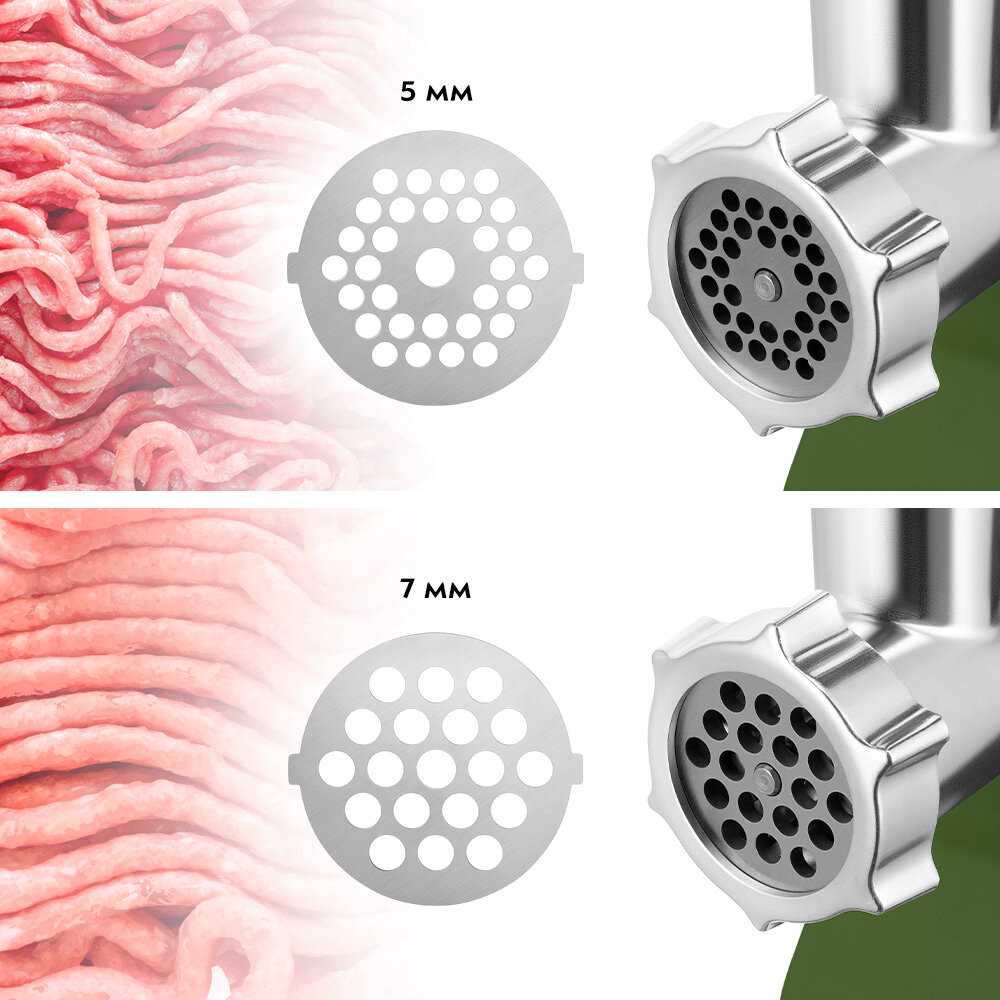 - Две решетки (5 мм и 7 мм) позволяют регулировать фарш.