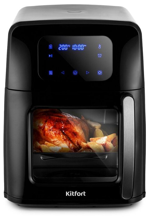 По плюсам - я довольна покупкой. Можно запекать, выпекать, делать картофель фри или деревенский дольками в специальной чаше. Можно сушить фрукты. Выпечка готовиться без большого количества масла. Разогревается еда быстро (только переложить из пластиково контейнера). Единственное что я пока не пробовала - это запекать курицу целиком, только частями. Но такая возможность есть, в наборе идёт специальный металлический конус.