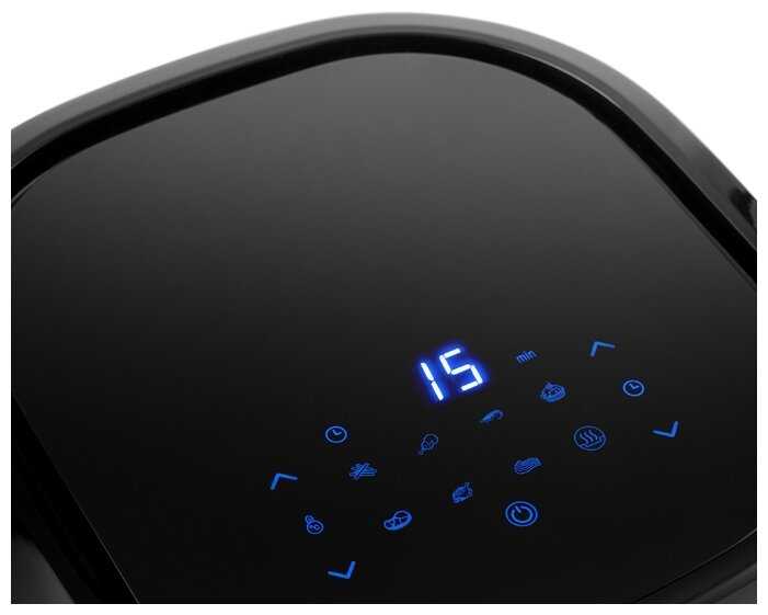 Первое, что хотелось бы отметить-это дизайн: сенсорная панель управления, глубокий чёрный цвет, идеально вписавшийся в дизайн кухни. Внешний вид аэрогриля очень порадовал.