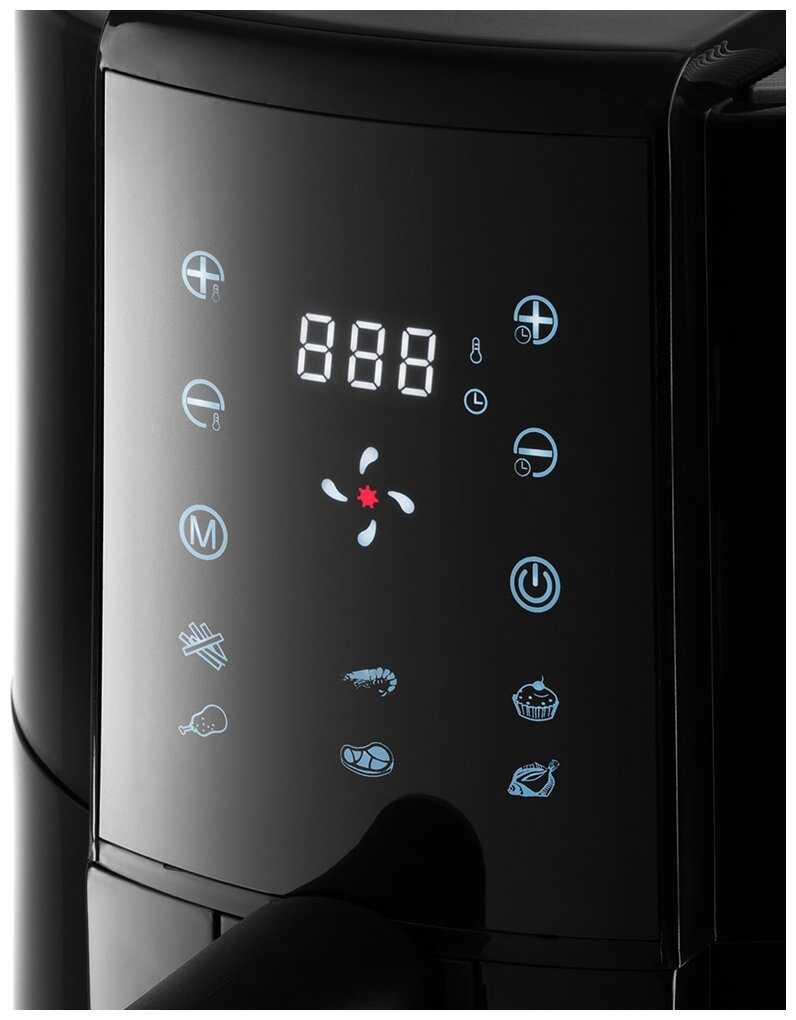 Управление довольно простое и интуитивно понятное. Цифровой дисплей и сенсорные кнопки позволяют легко настраивать время и температуру. Также стоит отметить, что аэрогриль быстро разогревается, что экономит время на приготовление.