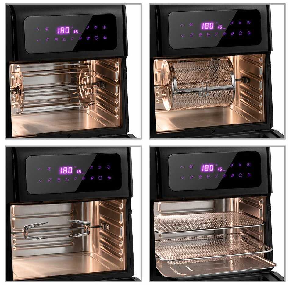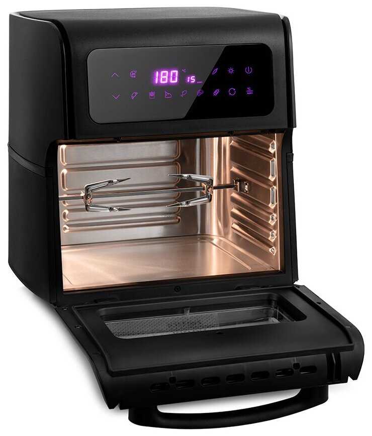 - + Красивый дизайн и необычная фиолетовая подсветка. Очень подробная и понятная инструкция, даже рецепты есть. Еда при приготовлении готовится равномерно, золотистая хрустящая корочка, получается сочно и не пригорает. Хорошая комплектация (шампур, вертел, корзина для фри и др) и целых 8 автоматических программ с возможностью выставить параметры вручную. Аэрогриль не занимает много места