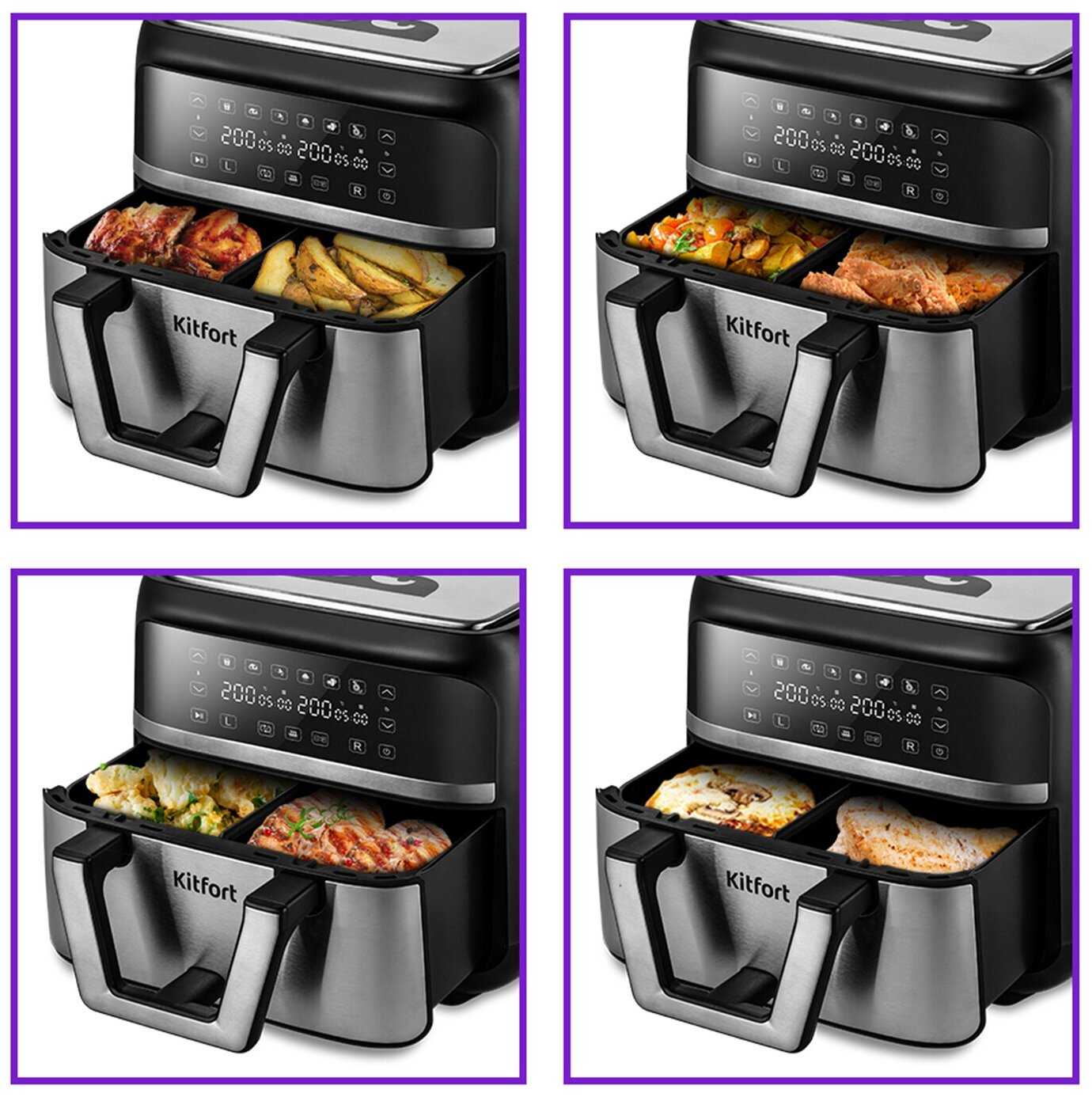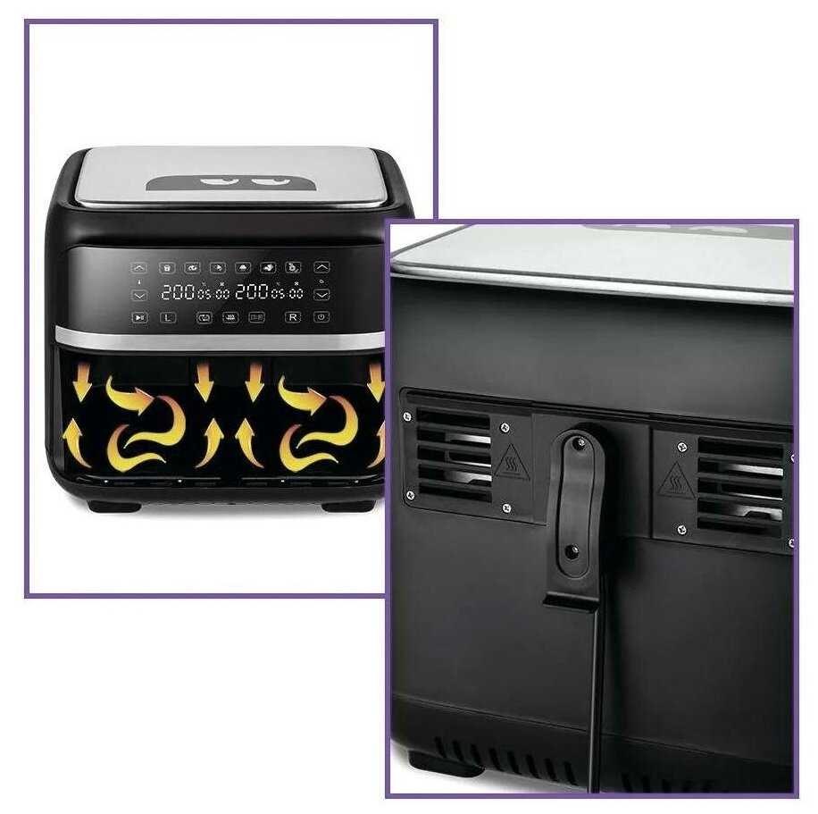 Перегородка разделяет 8-литровую чашу на два независимых отсека, позволяя готовить разные блюда с индивидуальными настройками температуры (до 200°C) и времени. Пользователи успешно готовят мясо с гарниром без смешивания запахов, например курицу с овощами или рыбу с картофелем. Система синхронизации автоматически завершает оба процесса одновременно, даже при разной продолжительности готовки. -