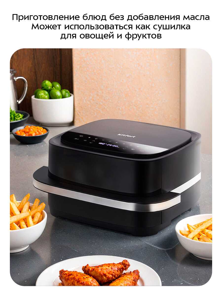 Основное преимущество – идеальная прожарка без лишнего масла. Картофель получается с хрустящей золотистой корочкой, курица – невероятно сочная внутри, с аппетитной румяной поверхностью. Рыба, овощи, даже простая выпечка – всё удается на отлично. Особенно ценю возможность гибкой настройки: 8 автоматических программ охватывают основные задачи, а ручной режим позволяет точно выставить температуру (диапазон широкий) и время под любой рецепт – хоть из кулинарного блога, хоть собственный эксперимент. Готовит быстро, вкусно и гораздо полезнее традиционной жарки: жир стекает, а блюда остаются сочными. Это принципиально другой, более здоровый подход.