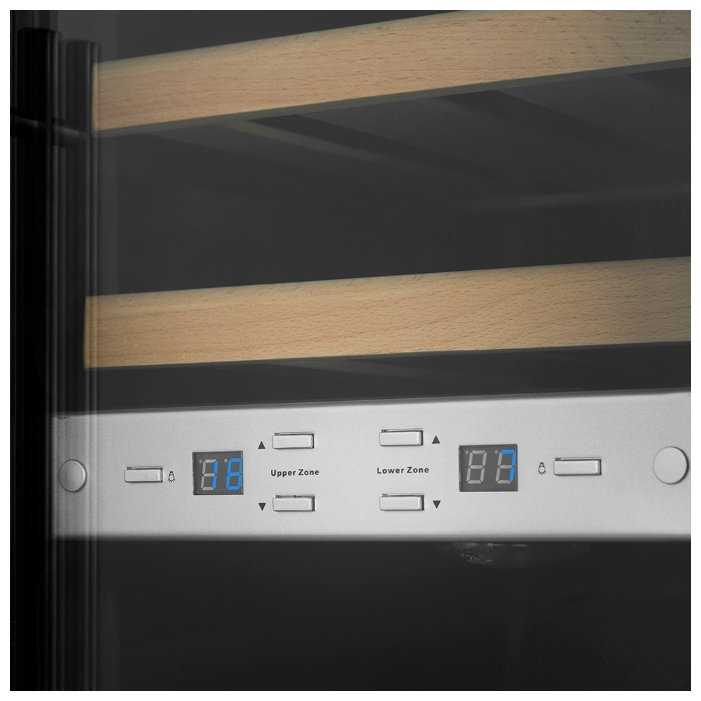 - Верхняя зона для белого вина (8-10°C), нижняя для красного (16-18°C), что позволяет хранить разные вина оптимально.