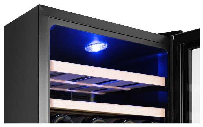 - Расстояние между полками узкое (для стандартных бордосских бутылок); шампанское, широкие или длинные бутылки не помещаются без снятия полок.