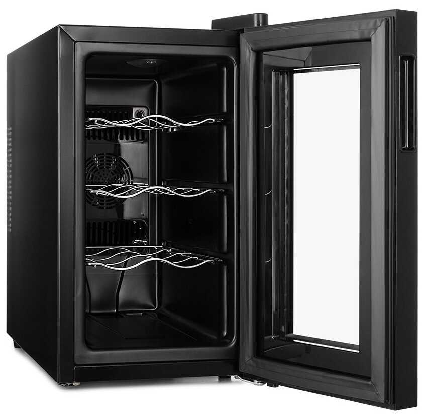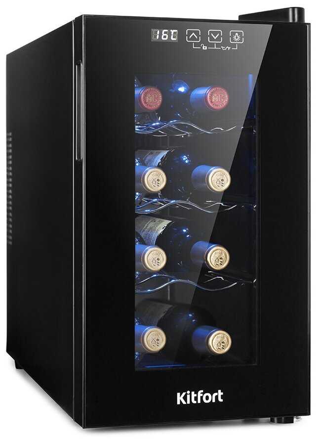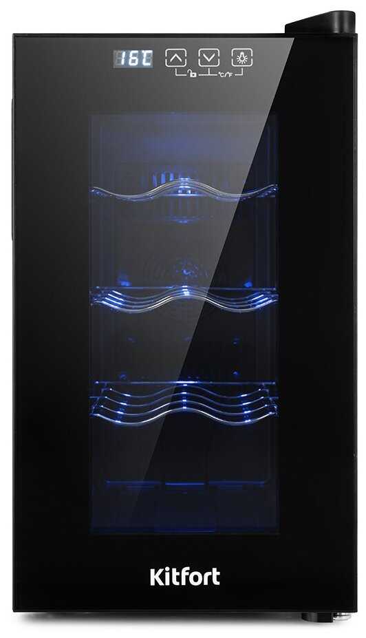 - + Выглядит симпатично, интересная подсветка (слишком игривая, но отключаемая), тихий, большой диапазон температур в камере, влезает 6 бутылок вина + 1 шампанского, либо 8 бутылок вина