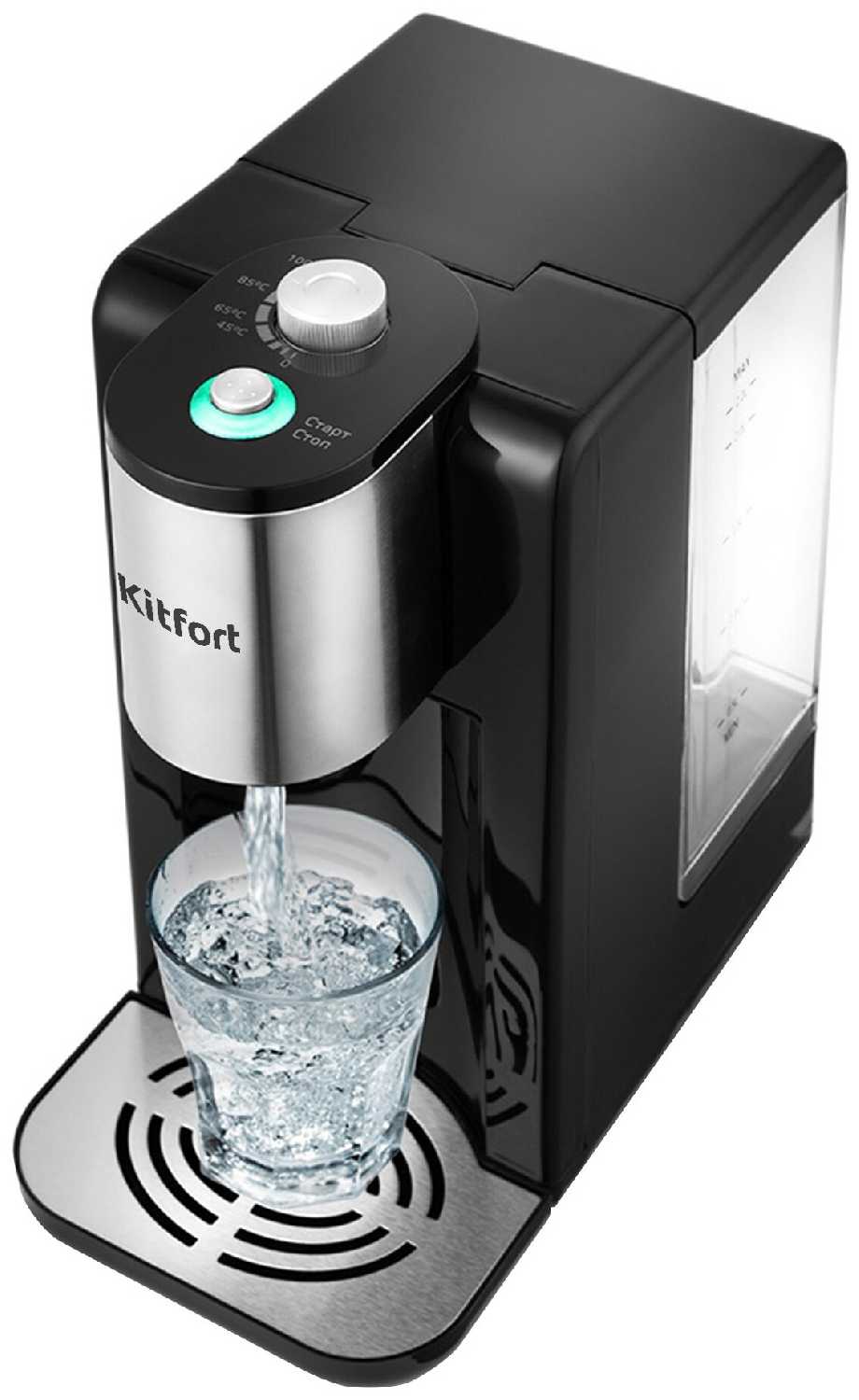 Был куплен взамен отработавшего своё термопоту. Главным преимуществом этого прибора считаю то, что вода не кипятится несколько раз как в обычных чайниках. В резервуаре вода находится комнатной температуры и вкусовые качества воды не ухудшаются как в обычных термопотах или офисных кулерах (диспенсерах). Да набор воды в чашку происходит медленнее, чем в термопотах, но я в процессе набора кладу в чашку чай и сахар, тем самым использую это время не в пустую. Очень порадовал механический переключатель температуры и механическая кнопка налива своей простотой конструкции. Не знаю может ли она хотя бы теоретически самопроизвольно отщёлкнуться и включить подачу кипятка, в любом случае она будет надежней сенсорной. Расположение панели управления сверху прибора не даёт шансов пару попасть на органы управления и вам не нужно подставлять свои руки под пар от набираемой воды в чашку. Так безопасней особенно если есть дети. Прибор устойчив. Своими присосками на днище обеспечивает достойное удерживание на поверхности и противостоит (в разумных пределах) опрокидыванию. При нагревании воды слышны прикольные звуки, но не громко, домочадцев не разбудят. Температура выхода воды из сопла примерно 93 градуса (при включении регулятора температуры на 100). После набора воды в чашку, стоящую в шкафу при комнатной температуре составляет около 84 градусов. Замерял температуру воды на выходе из сопла кулера на работе- 85 градусов, в чашке 78. При кипячении в чайнике на плите, температура воды в такой же чашке составила 86,5 градусов. (наливал ещё кипящую, замер сразу после налива). Делаю вывод, что в КТ-2502 вода действительно кратковременно закипает при установленном на максимум регуляторе.