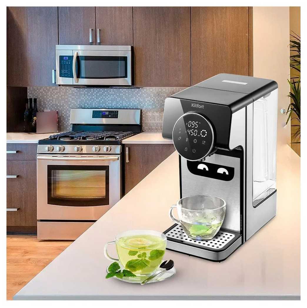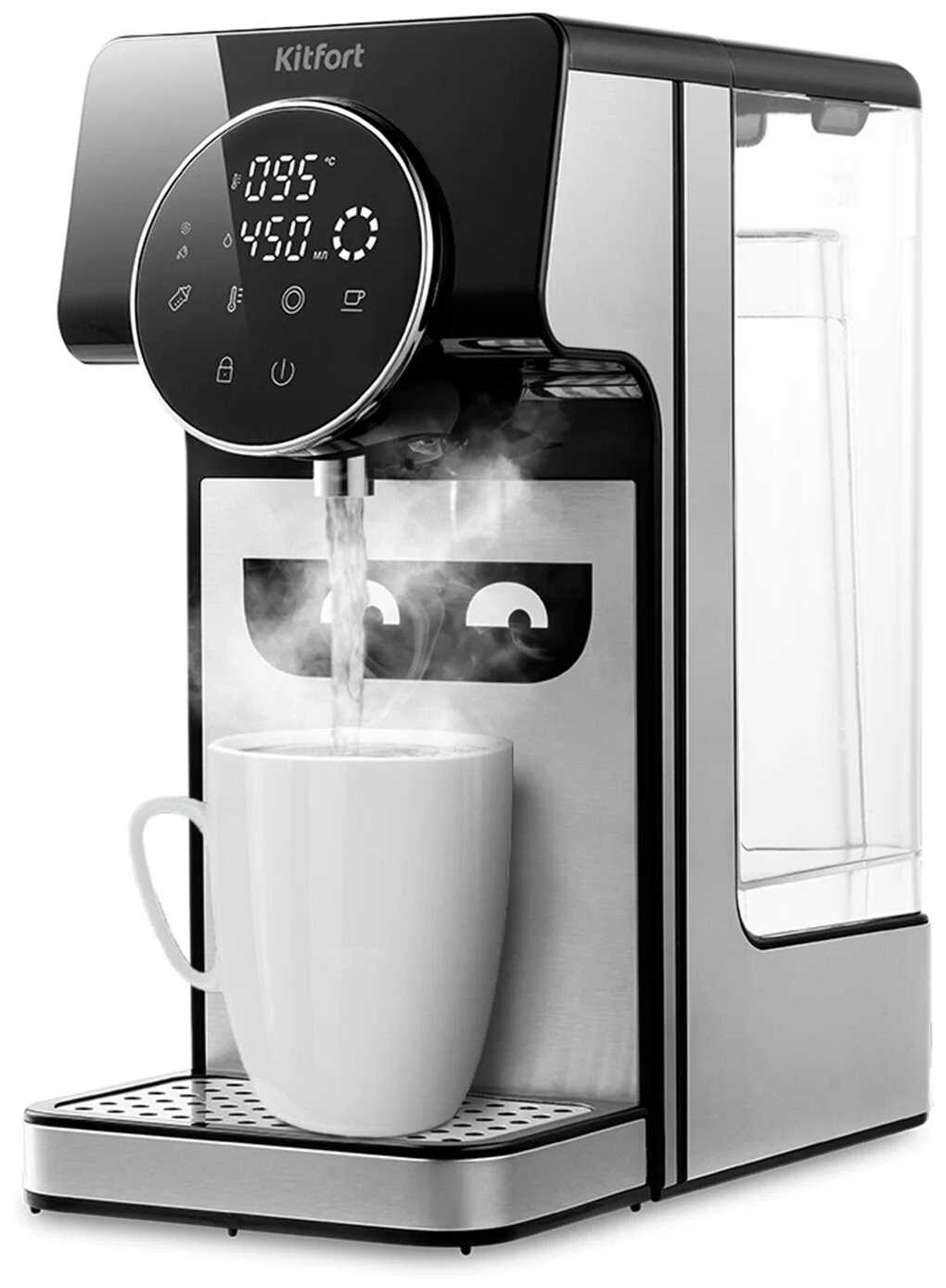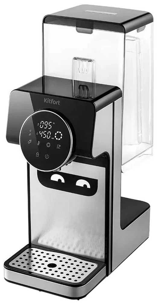 Решили заменить наш старенький термопот, выбирали между двумя фирмы kitfort. Остановились на этом, так как привлекла функциональность. Нравится, что можно выбрать необходимую температуру, что удобно при приготовлении детского питания. Так же отмечу удобство выбрать необходимый объем. Поставил кружку, кнопку нажал и пошел заниматься своими делами. Удобный съемный бак для воды, легко отсоединяется и наливается. Не понравилось то, что при наливании без фиксированного объема, после нажатия на «стоп», наливается еще приличное количество воды. Но это не сильно страшно, на случай перелива предусмотрена подставка для чашки (в подставке есть место для удержания воды)