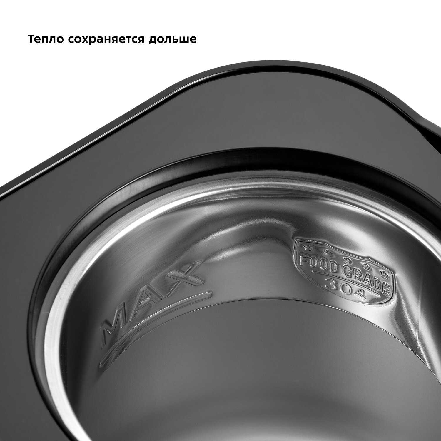 - Нержавеющая сталь внутри колбы обеспечивает долговечность и гигиеничность, минимизируя коррозию и облегчая очистку от накипи лимонной кислотой.
