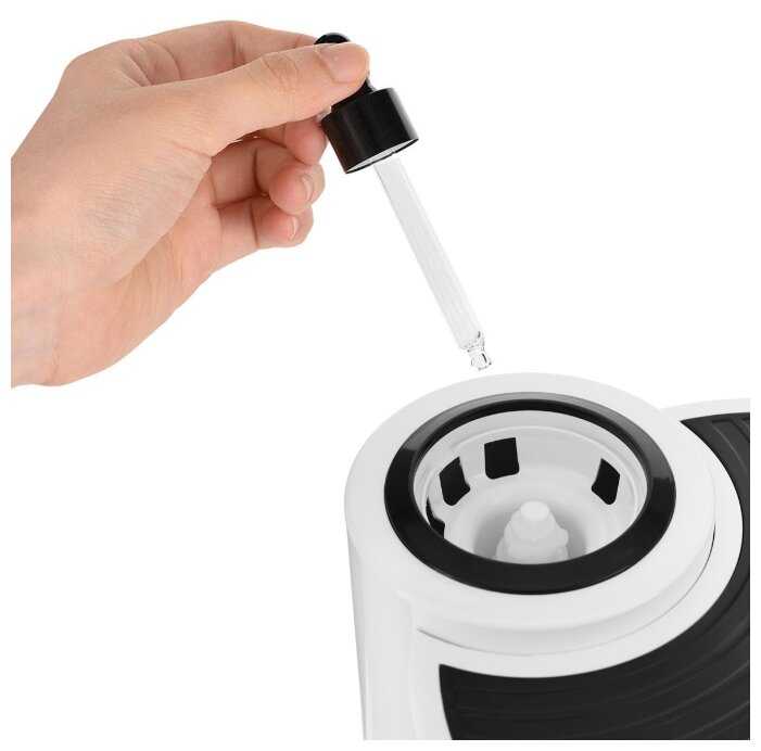 - Отдельный отсек для эфирных масел с бутылочкой и фильтром предотвращает смешивание воды и масел, упрощая очистку.