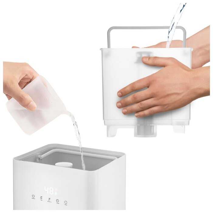 Очень удобно, что можно залить воду сверху. Легко мыть, емкость переносная, можно наполнить и принести. Если надо срочно и быстро увлажнить, включаю на самую большую подачу, есть тёплый пар и ионизация. У Гигрометра увлажнителя, в сравнении с отдельно купленным, показания разнятся на 1-5%. Что вообще считаю не критичным. Если вода закончилась, мигает красным и пищит, очень удобно. В целом очень классный.