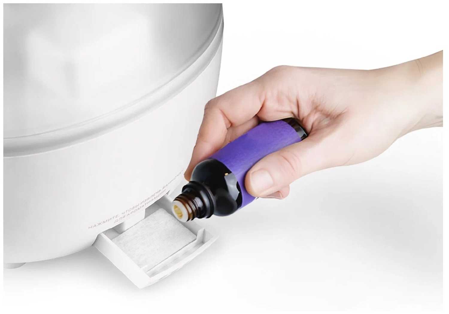 Внешний лоток с ватным диском позволяет добавлять масла без контакта с основным резервуаром. Для ощутимого аромата требуется 30-40 капель эфирного масла – тогда запах распространяется ненавязчиво и сохраняется несколько часов. При минимальном количестве масла эффект почти незаметен. -