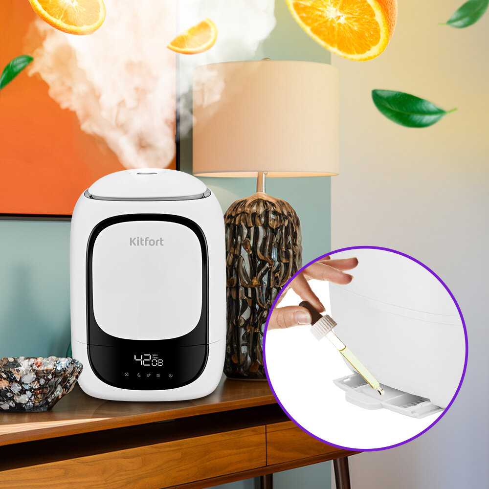 - Отсек для эфирных масел без смешивания с водой, легкая ароматизация лавандой или эвкалиптом.