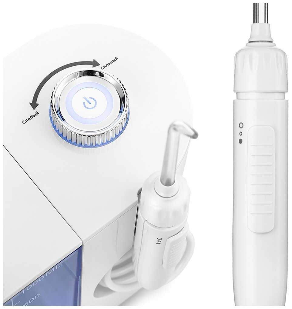 3. Мощность и настройки:Отличный диапазон настроек давления струи! Можно выбрать комфортный режим для чувствительных десен или включить мощную струю для более тщательной очистки (особенно актуально при ношении коронок или мостов).