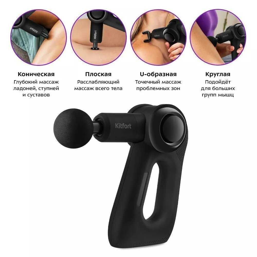 В комплект входят несколько насадок: круглая для общего массажа, плоская для крупных мышц, коническая для точечного воздействия и U-образная для зоны позвоночника. Каждая предназначена для конкретных участков тела — например, шарообразная насадка эффективна для бёдер и плеч, а "рогатка" оптимальна для шеи. Пользователи подчёркивают, что разнообразие аксессуаров позволяет адаптировать массаж под разные группы мышц и интенсивность. Все насадки легко меняются благодаря магнитному креплению. -