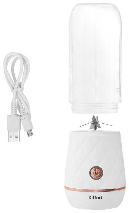 В комплект Kitfort KT-3006 входит: инструкция на русском языке -1 шт., стеклянная чаша- 1 шт., моторный блок с ножами - 1 шт., шнур для подзарядки через Micro USB2 (учтите, что в комплекте нет адаптера с вилкой) - 1шт,., крышка на ножи и крышка на бутылочку. И еще приятный бонус от производителя - кит-магнитик на холодильник. Чаша рассчитана на порцию примерно 300-350 мл. Нужно учитывать, что заполнять объём чаши нужно только на 80%. На чаше есть индикатор объёма – 350 мл. Разъем для подзарядки прячется за резиновой заглушкой. Заглушка присоединена к корпусу, поэтому ее не потеряешь - это реально удобно, особенно когда нужно промыть блендер. Заглушка надежно защищает от попадания влаги. Мою просто под проточной водой без моющих средств, т.к. в основном использую фрукты и овощи. Потом насухо протираю ножи.
