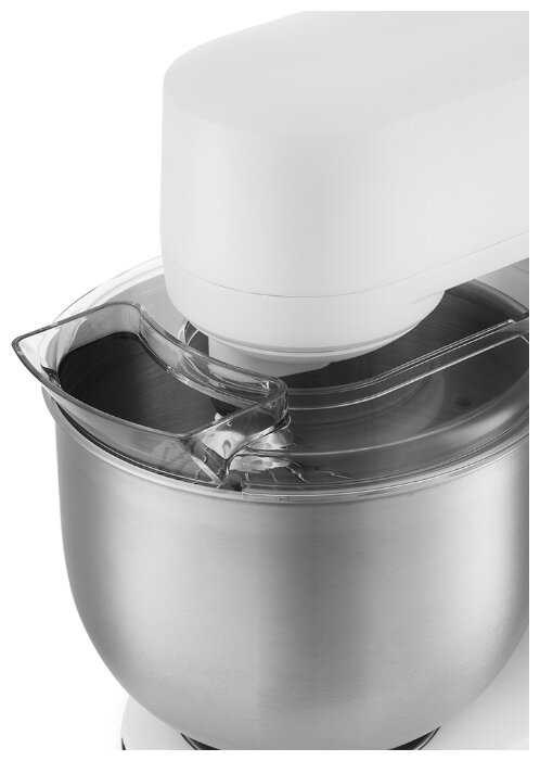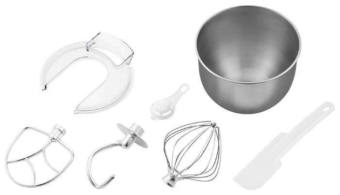 Состав набора: миксер; чаша; крышка чаши; три насадки: венчик, насадка для смешивания, крюк; лопатка; сепаратор для яиц.