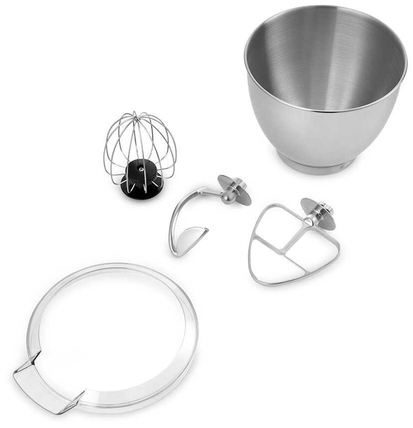 Венчики и насадки легко меняются, а сама чаша достаточно вместительная, чтобы готовить даже на большую семью