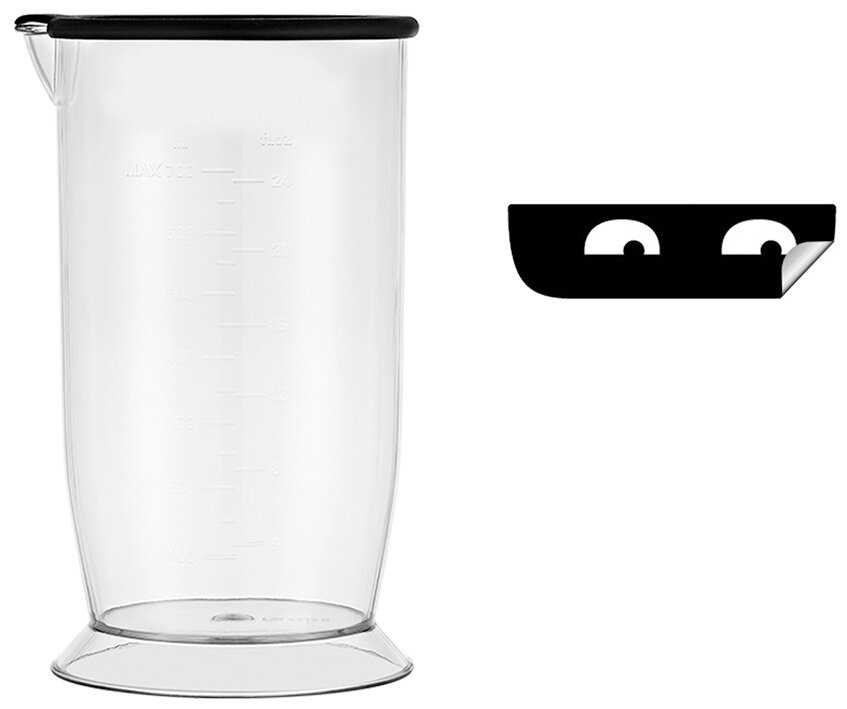 Стакан: из крепкого пластика, стенки "не играют", есть несмываемая градуировка (до 700 мл), общий объем около 850-900 мл; есть крышка (!) для удобного хранения коктейля/смузи/жидкого теста, но она не обеспечивает полную герметичность. - - Наклейки-глазки приклеены основательно, с трудом удалил их, клей – моё почтение.