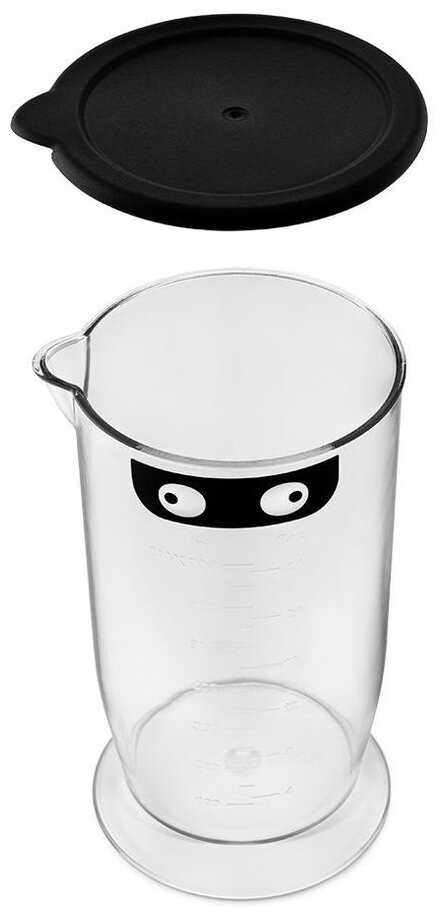 - Крышка-подставка для стакана выполняет двойную функцию: защищает поверхность стола и служит мерной шкалой.