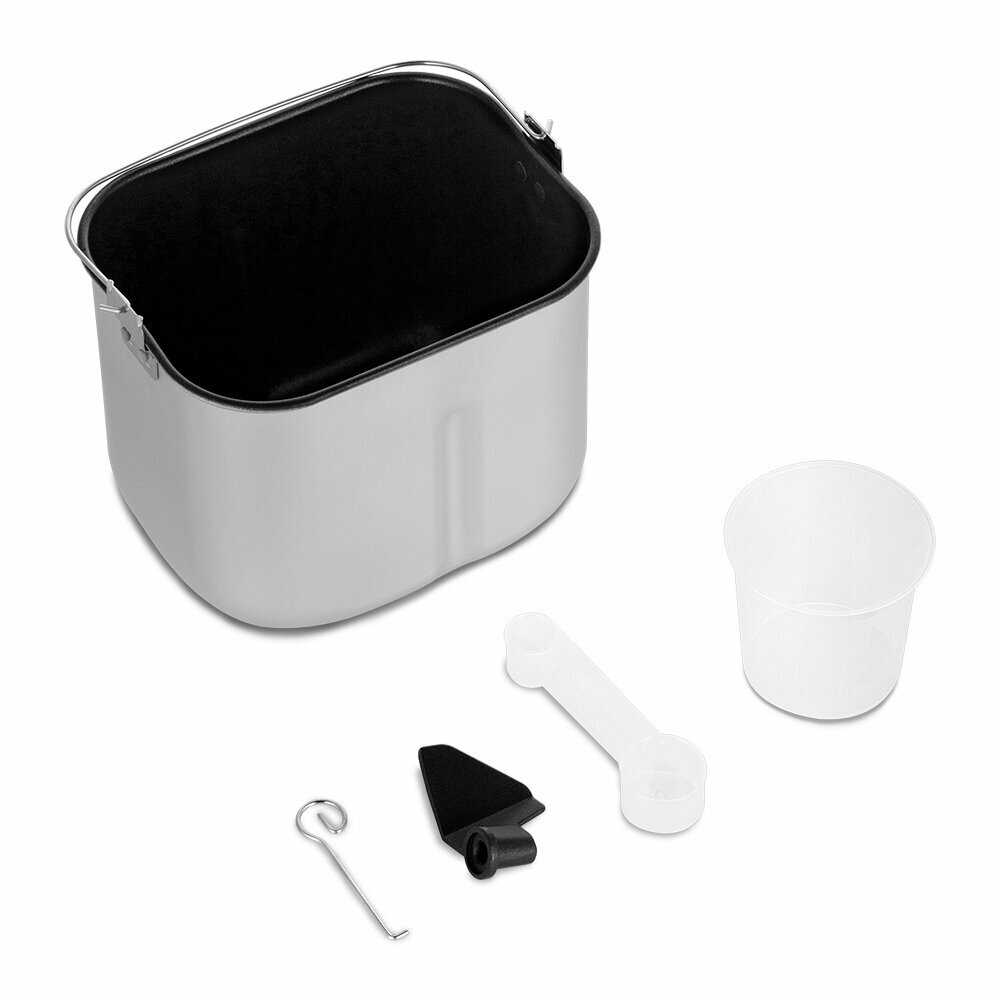Устройство предлагает несколько автоматических программ для выпечки разных видов хлеба (например, классический, французский, цельнозерновой) и кексов. Также есть отдельная программа для замеса теста без выпечки, которая идеально подходит для приготовления основы для пиццы или пирожков. Предусмотрена возможность выбора веса буханки (700 г или 900 г) и степени подрумянивания корочки. -