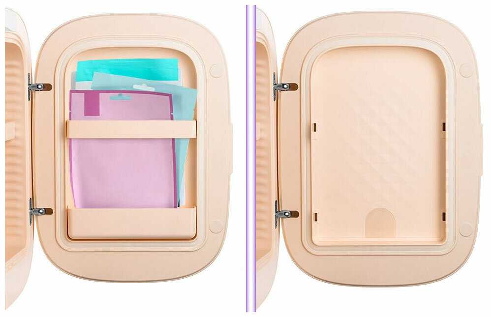 Очень милый дизайн. Достаточно вместительный, но я убрала верхнюю полку, иначе высокие тюбики масок не влезали. Мой первый холодильник для косметики и я нарадоваться им не могу )) - - Все таки шумный. Поставить его в спальню - плохая идея