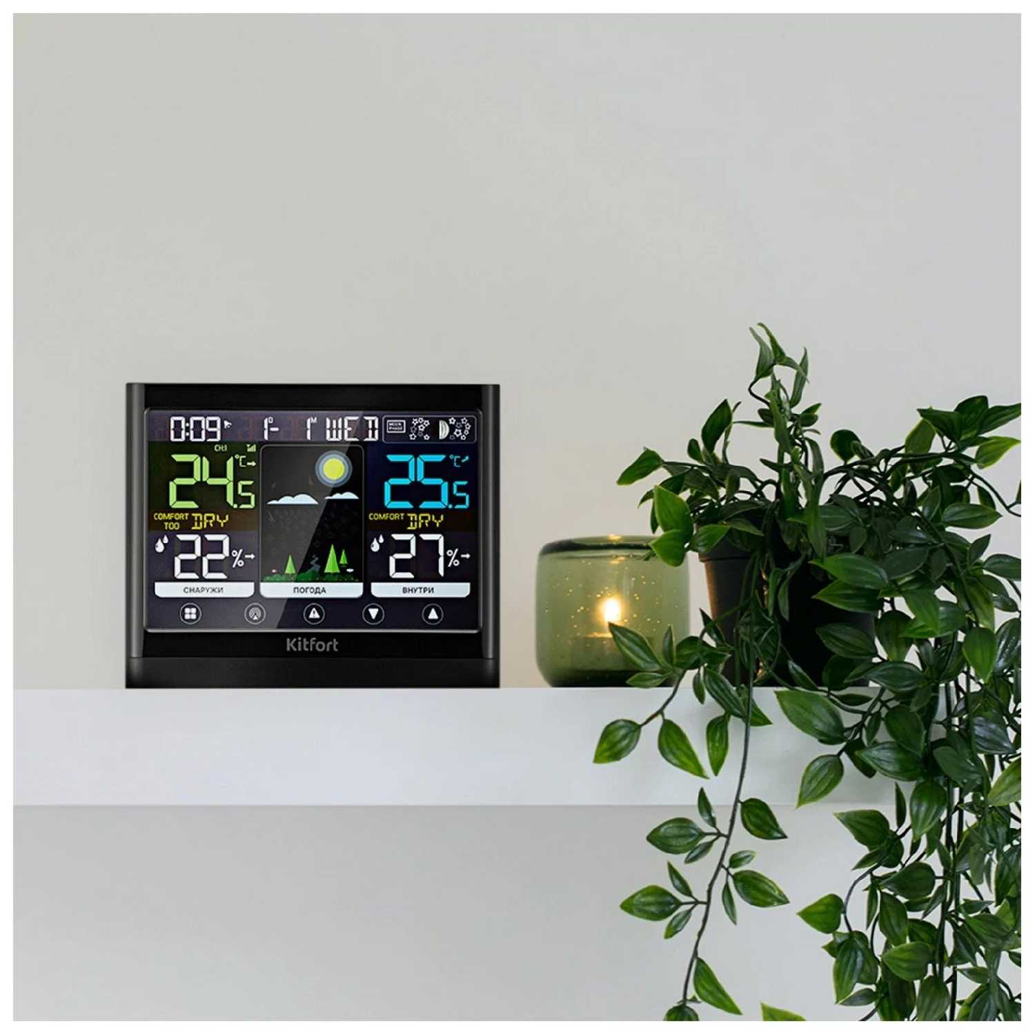 - + Давно хотел домашнюю метеостанцию, и случайно наткнулся на продукцию Kitfort. Пересмотрел характеристики всех представленных станций, выбрал эту потому что у нее есть настенное крепление и питание от сети. Понравился яркий, четкий дисплей, два уровня подсветки, крупные цифры, видно издалека. Углы обзора по горизонтали хорошие, по вертикали похуже. Внешний датчик подцепился сразу, можно докупить и добавить еще два. Настройка быстрая. Точность показаний не сверял с другими приборами, но особо за этим не гонюсь.