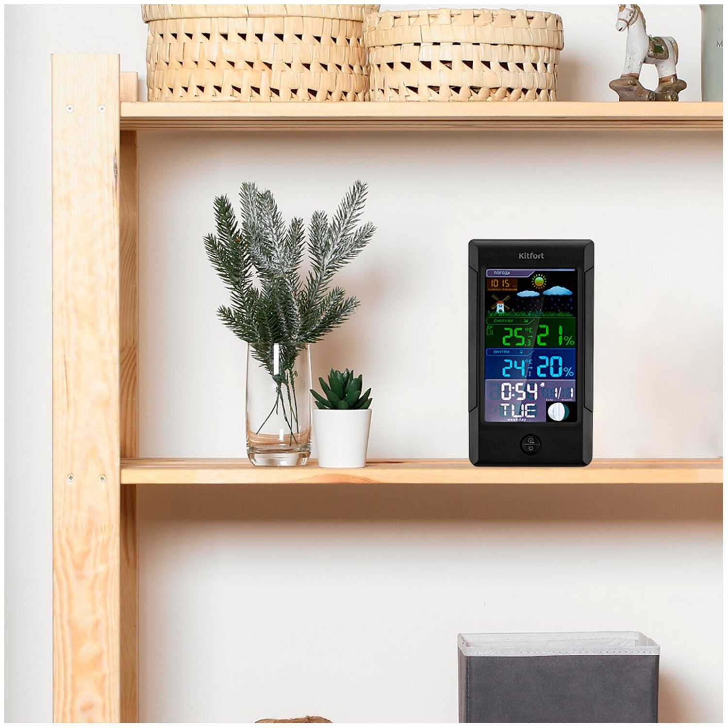 Выбрал метеостанцию Kitfort КТ-3322 потому что нижний предел измерения температуры -50 градусов Цельсия. В Якутскеи зимой бывает и -60., но в основном колеблется от -40 до -50.. У других приборов, в обычно -30, -40. Не знакю пока показывает ли -50, но ниже -30 показывет. Настоойки простые. Показывает температуру и влажность в помещении и на улице, дату, время, день недели, давление, фазу луны (никогда не понимал зачем это надо), есть будильник. Один беспроводной внешний датчик. В описании сказано, что он защищен от влаги, что очень сомнительно. Прибор выглядят отлично. Цветной экран. Но очень большая погрешность в измерениях температуры (проверял другими термометрами): в помещении показывает примерно на 2 грдуса выше, на улице выше от 3 -4. Про точность измерения влажности ничего сказть не могу. В целом, устройство меня устраивает за эти деньги.