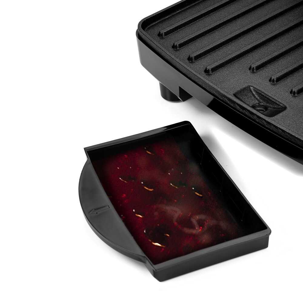Несъёмные панели с антипригарным покрытием легко очищаются благодаря специальной пластиковой лопатке из комплекта. Жир и остатки пищи удаляются влажной тряпкой без усилий, а контейнер для сбора жира (ёмкостью ~120 мл) извлекается для промывки. Важно: использование абразивных средств запрещено. -