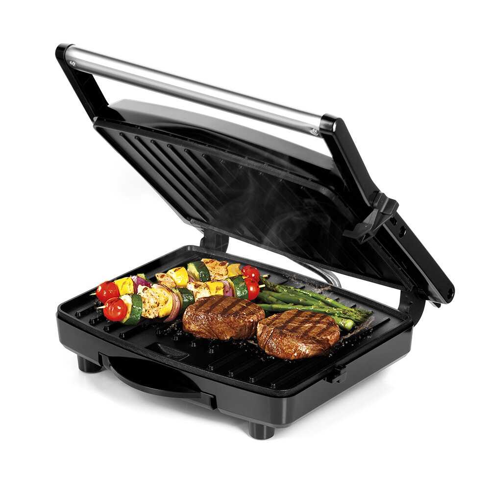 - Двусторонняя рабочая поверхность (гладкая + рифлёная "гриль") позволяет готовить разнообразные блюда: мясо, овощи, котлеты, сэндвичи и даже панкейки.