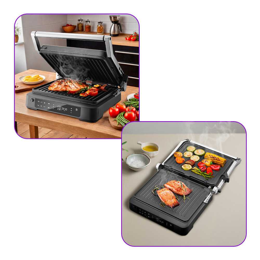 - Широкий спектр применения — от стейков и птицы до бутербродов и овощей — делает устройство многофункциональным кухонным прибором.