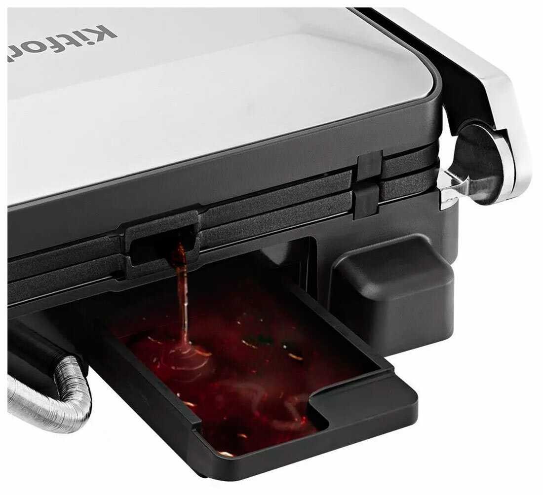 - Съемный контейнер эффективно собирает излишки жира и сок, упрощая процесс очистки и снижая уровень дыма при готовке.