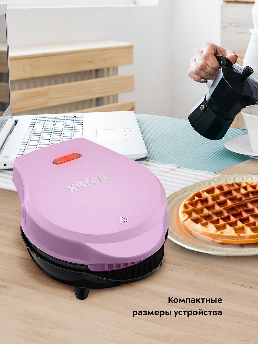 - + Пересмотрела много вафельниц и остановилась на этой, в первую очередь из-за красивого цвета, формы и размера. Вафельница такого приятного лаввндового цвета, просто игрушечка. Маленькая, вафелька получается диаметром 10 см. Может кому-то и мало, но я такую и хотела. У меня уже есть вафельница Kitfort KT-1611 на две венские/бельгийские вафли. Компактный размер. Удобно хранить, не занимает много места. По времени вафли выпекаются быстро 4-5 мин. Панели смазываю только в начале выпекания один раз кокосовым маслом, вафли не пригорают, легко вытаскиваются. Печь одно удовольствие. В инструкции несколько рецептов, как раз сейчас испекла два вида вафель: творожные с сыром и творожные с молоком. Вафли вкусные 😋 , мягкие. И главное полезные, потому что я знаю что именно положила в тесто, в отличии от покупных. Вафельницу рекомендую. Kitfort ❤️ 🐳
